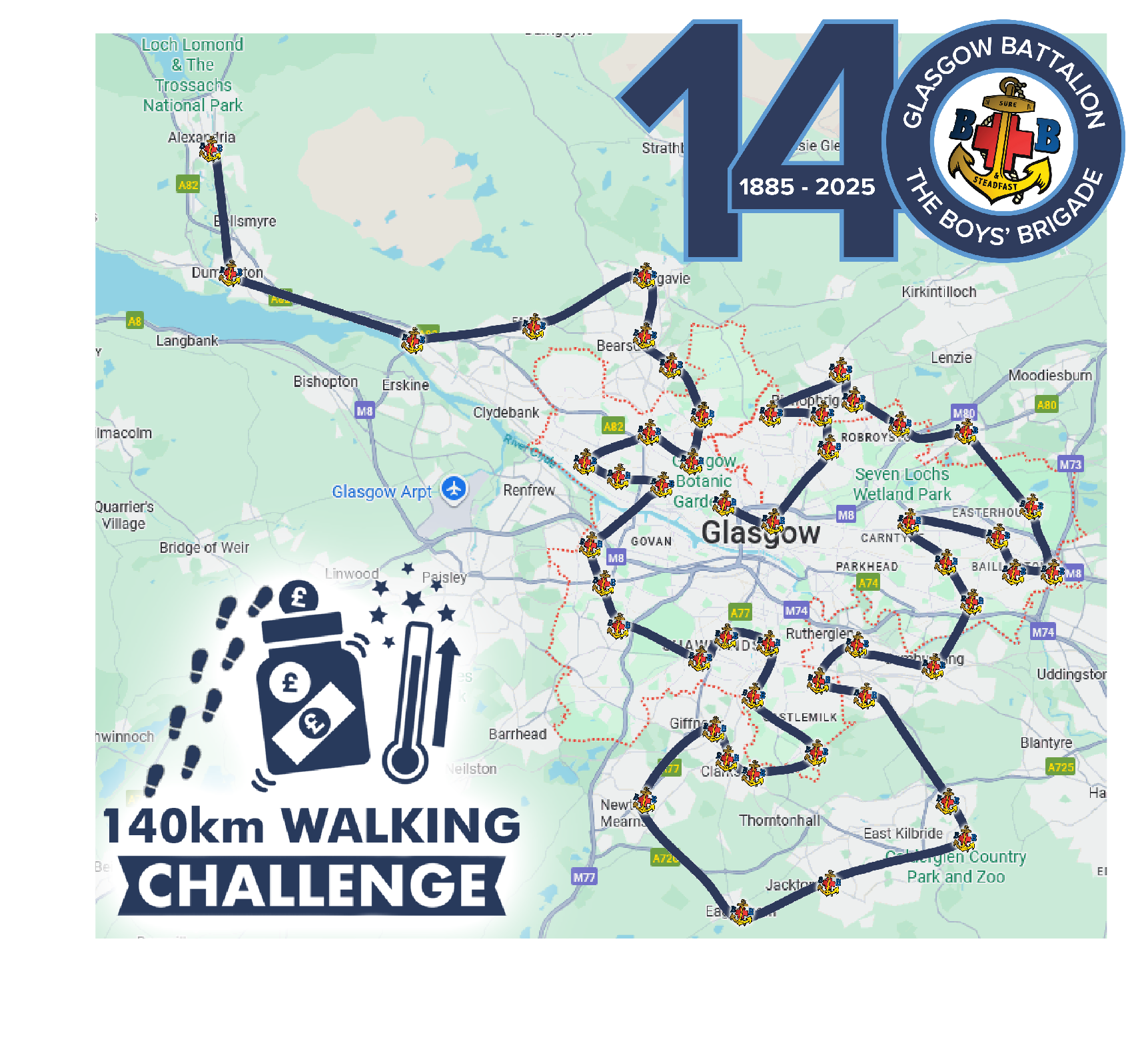 Beginning at the 1st Vale of Leven BB Hall in Bonhill, Alexandria, Jim visited every current BB Company location across our Battalion on foot, the journey finishing at Kelvin West Church in the West End, the home of the 1st Glasgow, a distance of 140km.